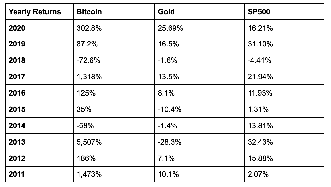 It’s hard to predict markets, and you can lose a lot of money by doing so, that’s why investments should be treated as a long term game. I will share annualized returns for Bitcoin, Gold, and an Index of the USA’s 500 most valuable companies, to show that most investments tend to appreciate with time.